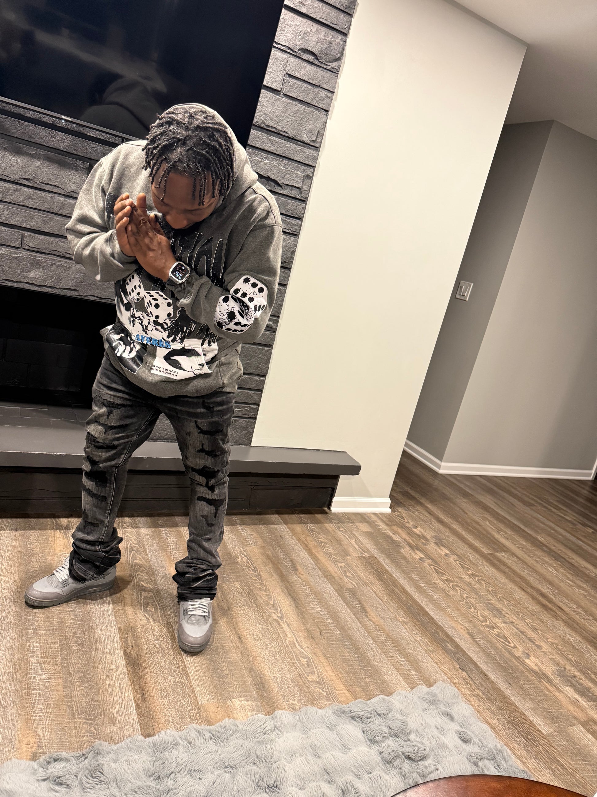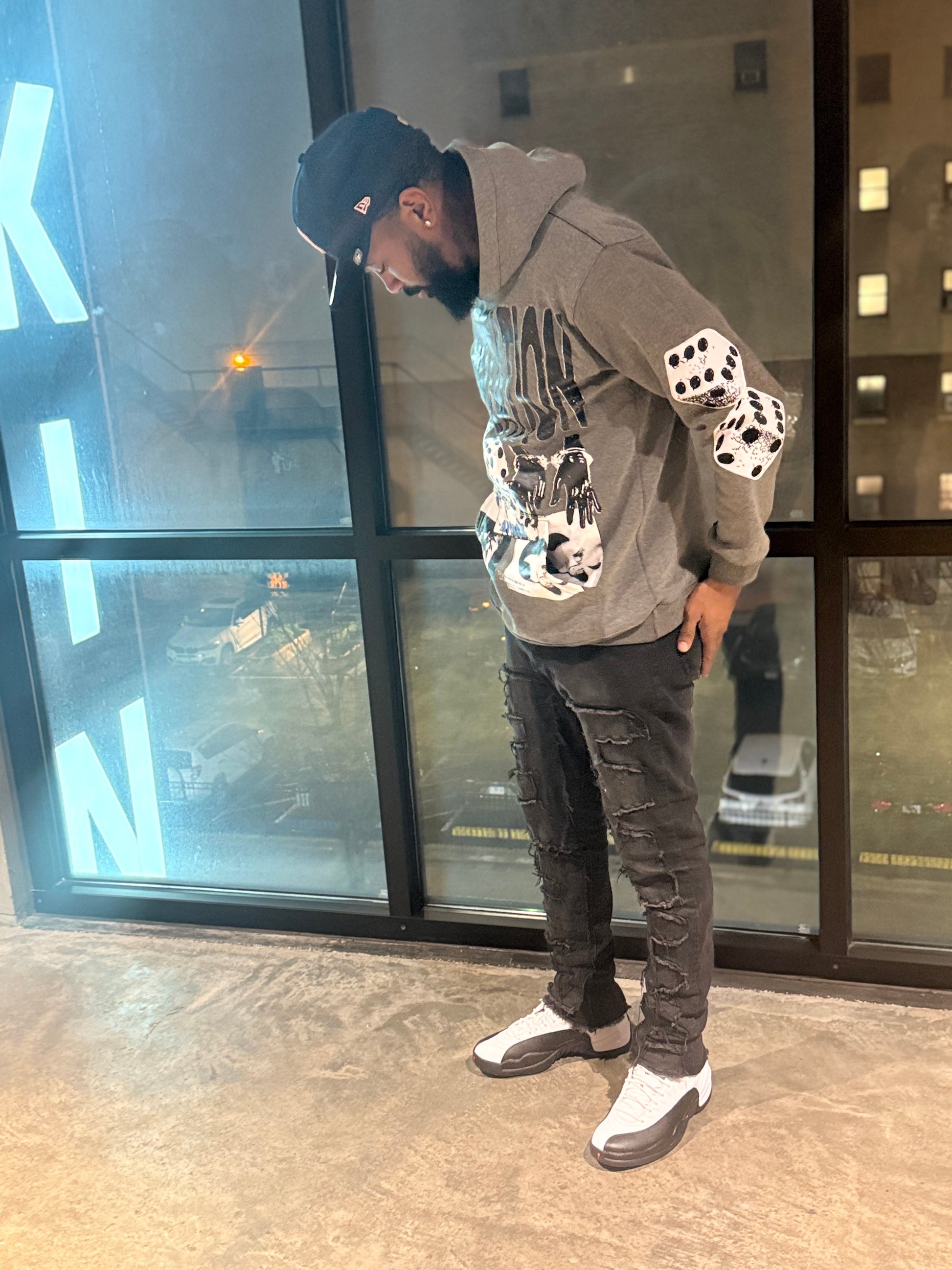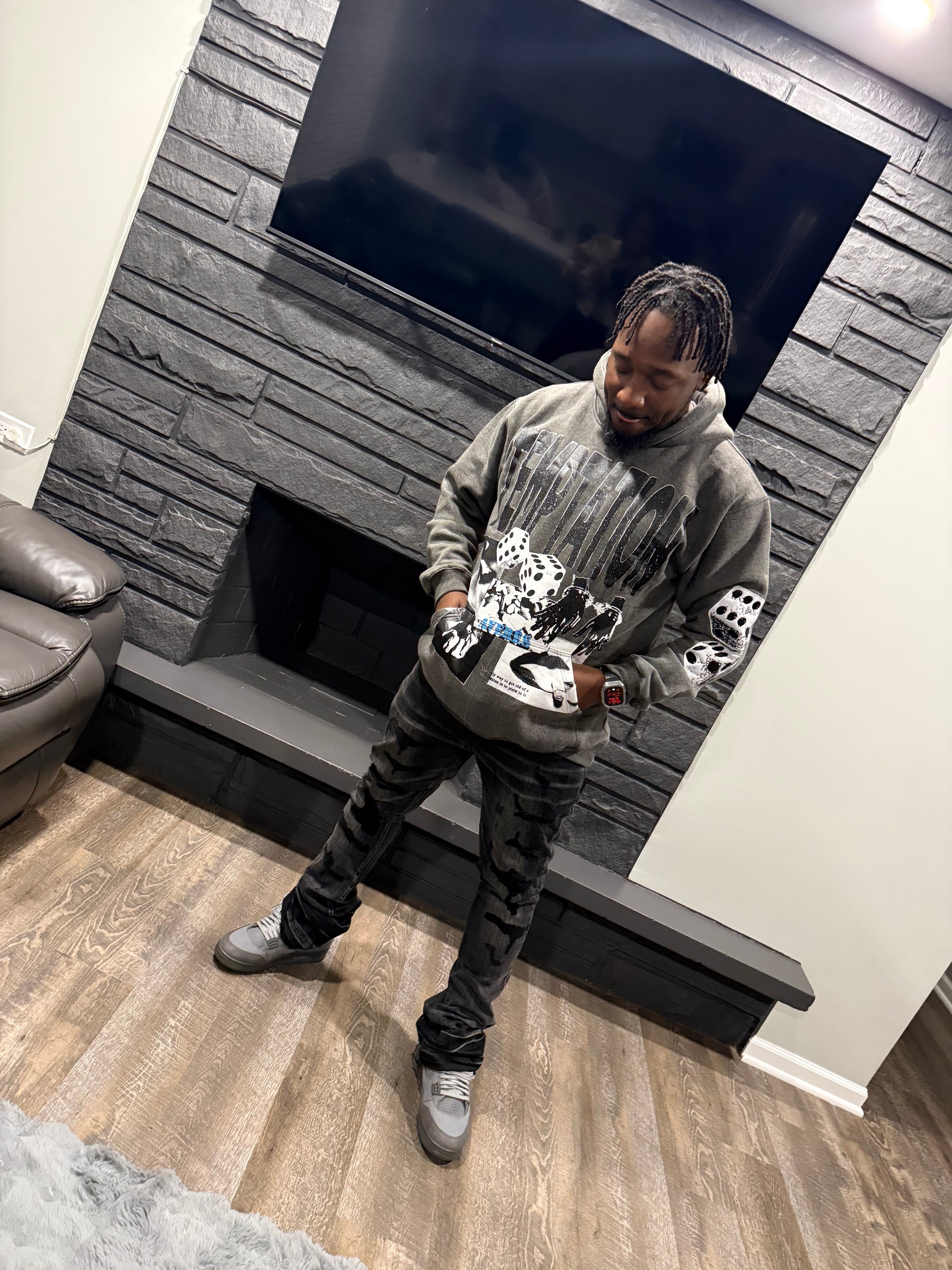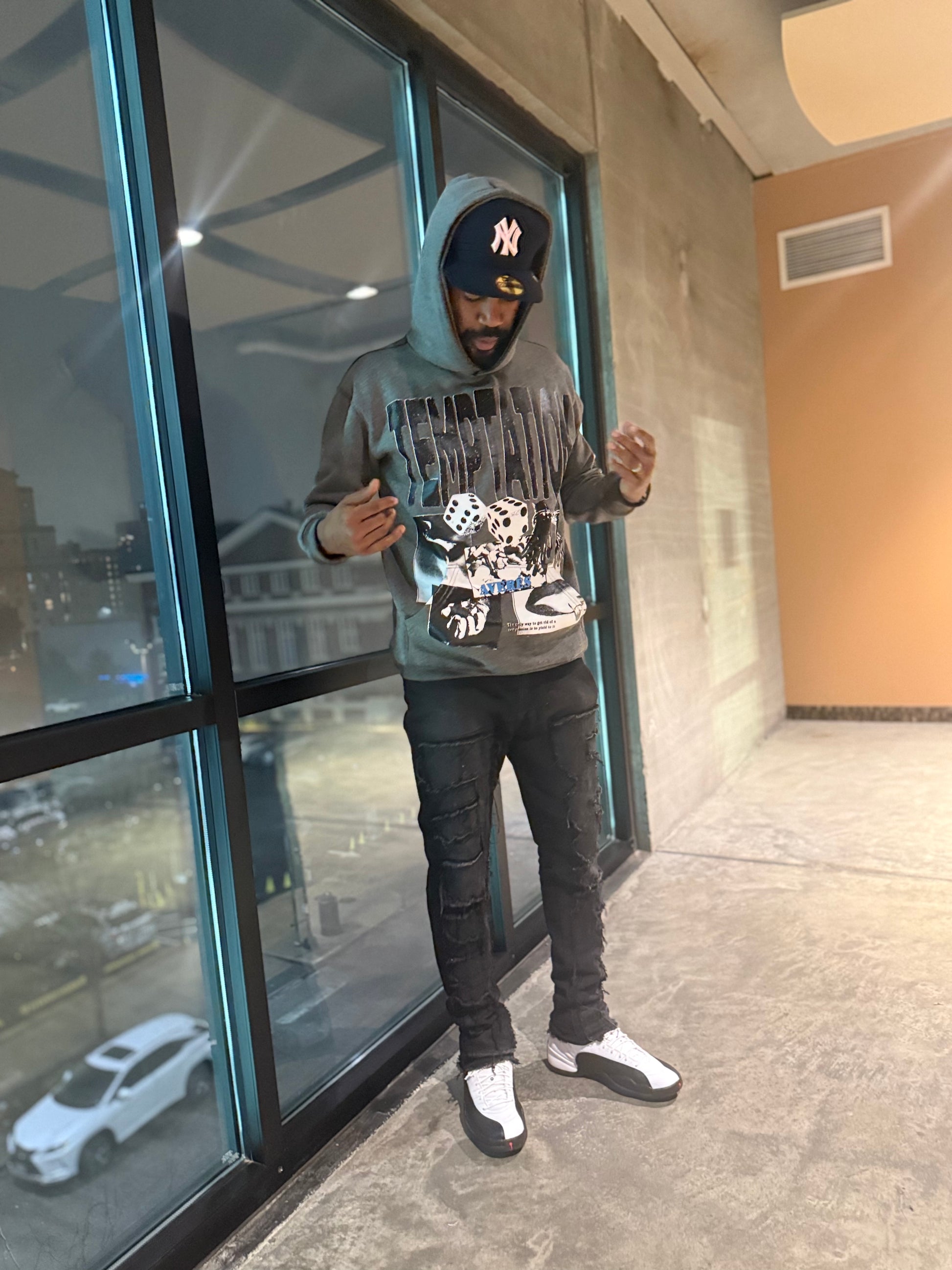 The Temptation: Roll of Vice hoodie from AVERÈS is a study in duality — crafted from heavyweight cotton in a charcoal acid wash, each piece is uniquely faded, like the consequences of a choice you can't take back. The front features a bold screen-printed graphic: the word “Temptation” commands the chest, anchored by a row of boxed-in vices, and centered by a pair of dice — a symbol of chance, risk, and fate.